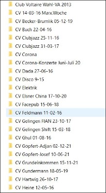 Hallo allerseits, am vergangenen Dienstag hat die PG auch über unser Jubiläum gesprochen. Ergebnis: Am Komplex "Bauen und Wohnen" würden sich Wolfgang Weitz, Richard und ich beteiligen, womit dieses Thema erst mal abgedeckt ist. Für den anderen Komplex ("Antifa") hat sich leider niemand gefunden. Darüber müssen wir am 8. 2. reden. Ich habe im Lauf der vergangenen Jahre recht viele Fotos von Veranstaltungen im Club gemacht. Unten findet Ihr eine thematische Übersicht. Bilder vom Jubiläum sind noch nicht dabei. Unter alldem ließen sich bestimmt Motive für eine Ausgestaltung der Wände im Club finden. Schöne Grüße Gert