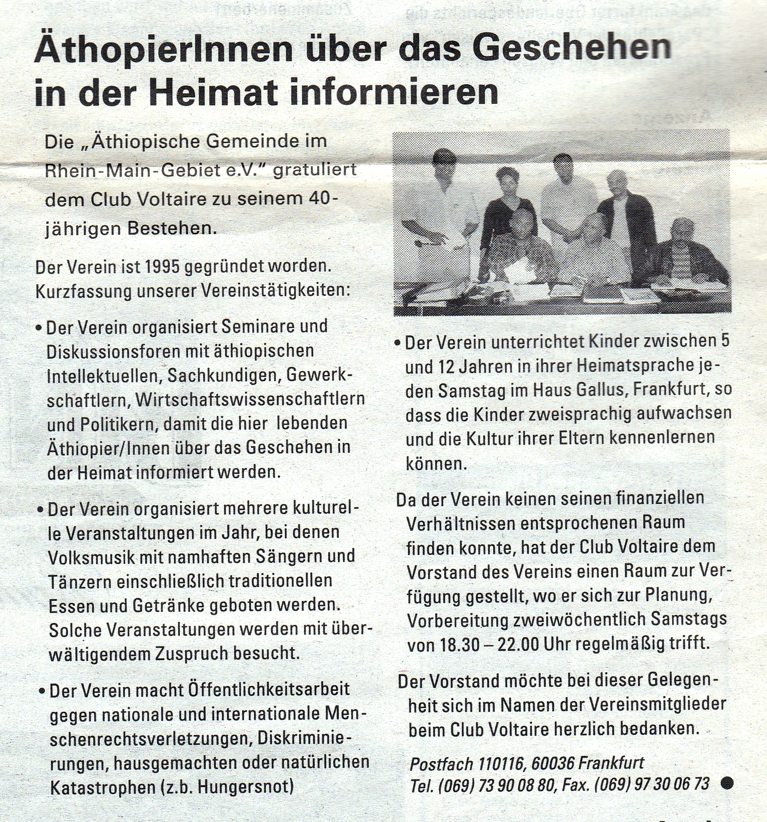 Hallo, in der "Frankfurter Randschau", der Zeitung zum 40. Club-Jubiläum, ist ein Artikelchen einer "Äthiopischen Gemeinde" abgedruckt (Anhang). Könnte man vielleicht dazu montieren. Ciao Gert -----Original-Nachricht----- Betreff: [Club-Jubiläum60] Stellwand 2/3 April Datum: 2022-03-18T11:35:20+0100 Von: "Club Voltaire - Büro" <clubvoltaire@t-online.de> An: "jubilaeum60@mail.club-voltaire.de" <jubilaeum60@mail.club-voltaire.de>, "Lothar Reininger" <lotharreininger@web.de> Hallo, das Büro hat ja am Dienstag den Arbeitsauftrag bekommen, das Plakat für das Solidaritätswochenende zu erstellen. Lothar, du schlägt vor folgenden Text aus der Jubi-Broschüre zu nehmen: "Schon in der Gründungsphase des Clubs Voltaire hat die Unterstützung des Befreiungskampfes in Algerien eine wichtige Rolle gespielt. Sogar die Idee, ihn nach dem französischen Aufklärer Voltaire zu benennen, kam von einem Kämpfer der Befreiungsbewegung FLN. Später – nach 1967 – unterstützten die Clubmitglieder den Kampf gegen das griechische Militärregime tatkräftig. Auch der Widerstand gegen die Diktatu Francos in Spanien und die Auseinandersetzung mit dem Pinochetregime in Chile nach dem Putsch 1973 waren wichtige Bestandteile des Clublebens. Dieser Historie sind wir bis heute treu geblieben. Aktuell treffen sich regelmäßig im Club die Freundschaftsgesellschaft BRD/Cuba, die Städtefreundschaft Frankfurt/Granada (Nicaragua) und seit Mai 2016 die Initiative Städtepartnerschaft Frankfurt/Kobane. Daneben werden die Räume von Organisationen aus Bolivien, Brasilien, Venezuela, Eritrea und Südkorea genutzt. Oft organisiert der Club gemeinsame Veranstaltungen mit internationalen Solidaritätsgruppen. Im Veranstaltungsprogramm finden sich regelmäßig Vorträge und Diskussionen zu den Brennpunkten der weltweiten Konflikte und zu den Strategien der imperialistischen Zentren. Aber auch das Schicksal politischer Gefangener z.B. in den USA sind für uns ein Thema. Bei der Gründung der jüngsten internationalen Solidaritätsinitiative (Frankfurt/Kobane) erwies sich das „Netzwerk“ des Clubs Voltaire äußerst hilfreich: So konnten die Aktivisten Erfahrungen anderer Gruppen nutzen. Zum erfolgreichen „Netzwerken“ zählt selbstverständlich der anschließende Umtrunk nach den Sitzungen in der Kneipe des Clubs. Schließlich wollen die Beschlüsse und Diskussionsergebnisse begossen werden." Der Text ist an den rot markierten Stellen allerdings nicht mehr aktuell. Es treffen sich momentan keine Internationalen Gruppen hier ausser die FG, Kobane und Granada. Neben dem Text sollen Fotos das Ganze begleiten. Ich habe unsere Fotokiste im Büro durchgeschaut. Da ist nichts passendes drin. Die Bilder und Dokumente für die Kasette im historischen Museum hat Barbara Bromberger zusammengetragen. Hat jemand von Euch einen direkten Kontakt zu ihr um zu fragen, ob es ihrer Erinnerung nach dazu was in der Kasette gibt? Hat sonst jemand eine Idee, welche Fotos man benutzen könnte? Grüße, Lisa -- ____________________________ verein club voltaire e.V. kleine hochstraße 5 60313 frankfurt am main 069 - 292408 069 - 284579 clubvoltaire@t-online.de <mailto:clubvoltaire@t-online.de> <http://www.club-voltaire.de>