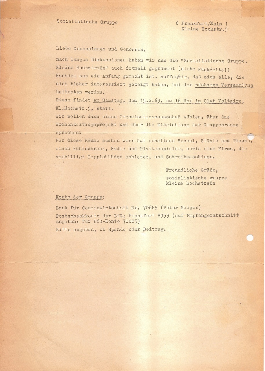 Liebe Freunde und Genossen , in der Anlage einige kopierte Dokumente zur Gründung der "Sozialistischen Gruppe kleine Hochstraße „ im Club Voltaire. Ansonsten noch ein kurzes Anschreiben zu meiner Person . Martin Krämer von der Gewerkschaft IG Metall mit dem ich während des Erinnerungsabend an Kurt Trautmann im „ Voltaire“ speziell über die Zeit Mai 1968 — bis Mitte 70 Iger Jahre gesprochen habe ist auch im Verteiler. Ich werde über meine persönlichen Erinnerungen ,an meine fünf Jahre Mitarbeit auch bald noch etwas zusammenhängendes schreiben. Wichtig ist natürlich das auch möglich viel visuelles Material wie die Plakate vom SDS "alle reden vom Wetter“ wir nicht oder das MAO Tse Tung Plakat :: „ Laßt Mai Tse Tungs Ideen bei allem das Oberkommando führen:: Ichhabe die zwei Bände „ MAO- Tse - Tung Ausgewählte Werke noch Original vergilbt aus Peking im Libresso erworben. —Ich habe außerdem die *Kultfilme*von *Jean Luc Goddard*:: *"MASCULIN FEMININoder Die KINDER VON MARX UND COCA COLA“ und LaChinoise“ in Deutscher Fassung .*Diese Filme haben uns sehr beeinflußt und sollten auf jeden Fall vorgeführt werden. Nicht ohne Einführung und Abschlussdiskussion. — Soweit die Protagonisten noch leben sollten sie auch zu Wort kommen , entweder persönlich oder mit Videobotschaften. Ich habe nach meiner Entlassung Bein der Bundeswehr im April 1968 gleich den Club Voltaire aufgesucht und neben mit stand der junge Schüler Dieter Dehm ( Lern) und berichtete der „ Else“ hinter der Theke von den ANTI-Springer DEMOS :: Haut dem Springer auf die Finger.—