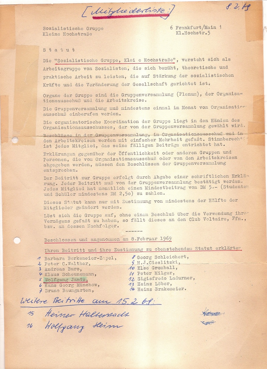 In der Anlage Das Gründungsdokument der „ SOZ Gruppe Kleine Hochstraße „ die im Keller von Rudi Kraus wieder aufgeraucht sind. Ich war ja damals auch dabei- Insgesamt wäre es vielleicht interessant wenn eine Sammlung von den verschiednen Erinnerungen an jene Zeit vorgetragen wird Ein Vortrag nur von einem ist vielleicht doch zu einseitig . Ich kann jedenfalls zwischen den Jahren etwas schreiben. ——— Ihr macht , oder habt gemacht, die Büchersammlung von Kurt Trautmann zu verteilen. . Wann trefft ihr Euch. -.? Falls das Buch „ der totale Notstands Staat auftaucht Wäre ich daran interessiert. Bis dann Bon Courage